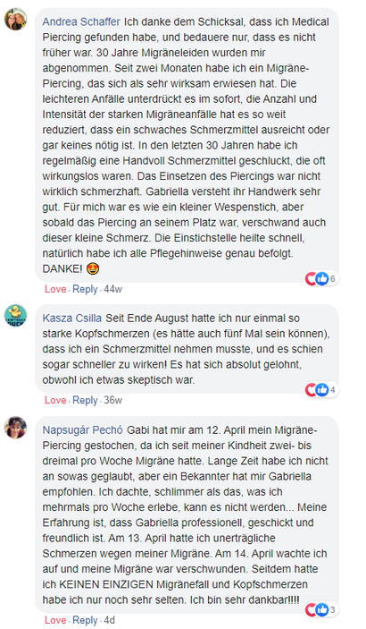 "Ich bin glücklich, dass ich mich nach langer Zeit endlich für das Migräne-Piercing entschieden habe. Ich bereue es nicht! Gabys Hand ist sehr präzise und sicher! Vielen Dank, ich bin sehr dankbar! P.S.: Dass ihr auch zwei Wochen später noch nachgefragt habt, wie es mir geht, war unglaublich wohltuend!"